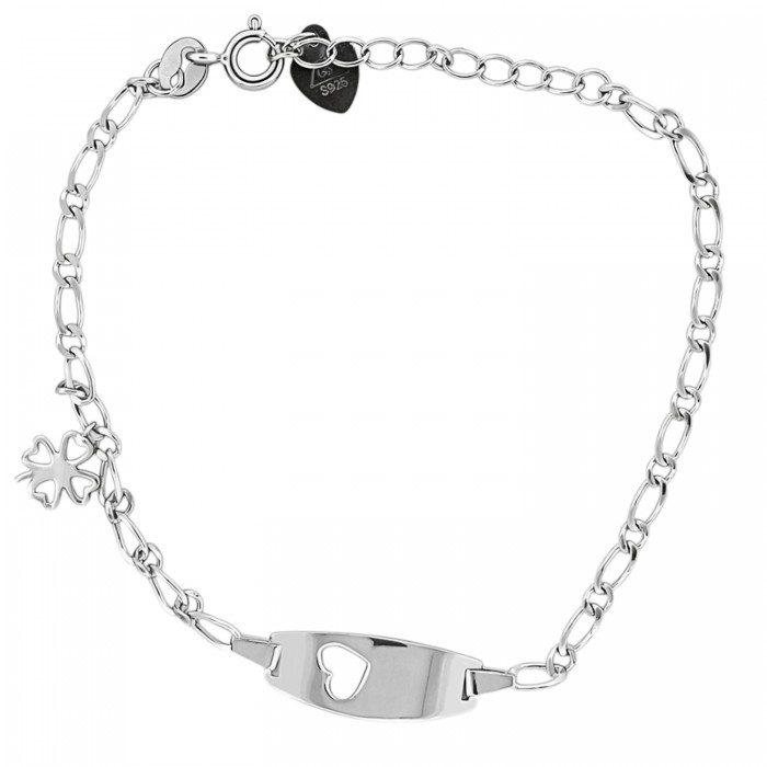 Bransoletka srebrna z blaszką i koniczynką to delikatny model o subtelnej, symbolicznej formie. Centralnym elementem jest gładka blaszka z wyciętym motywem serca, uzupełniona zawieszką w kształcie czterolistnej koniczynki.
