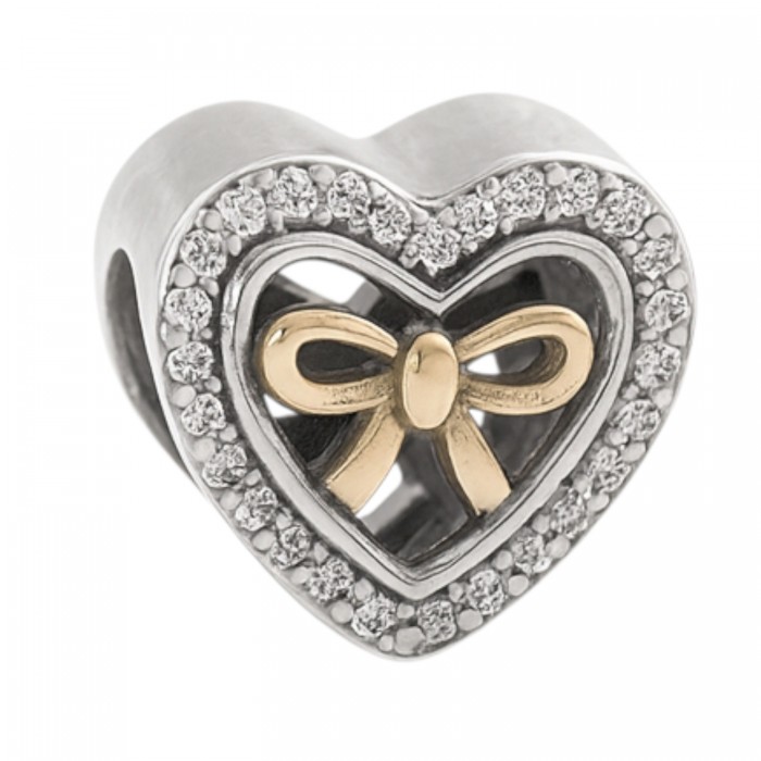 Przedstawiamy Państwu cudowną zawieszkę charms pasująca do większości bransoletek typu Pandora. Element zrobiony jest w całości ze srebra próby 925. Zawieszka to przepięknie dwustronnie wykonane serduszko zdobione małymi, przeźroczystymi cyrkoniami po obwodzie oraz kokardką w złotym kolorze w środku. Charms do wysyłki zapakowany jest w ozdobne etui. Zapraszamy do zakupu.