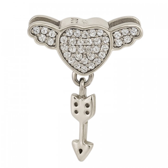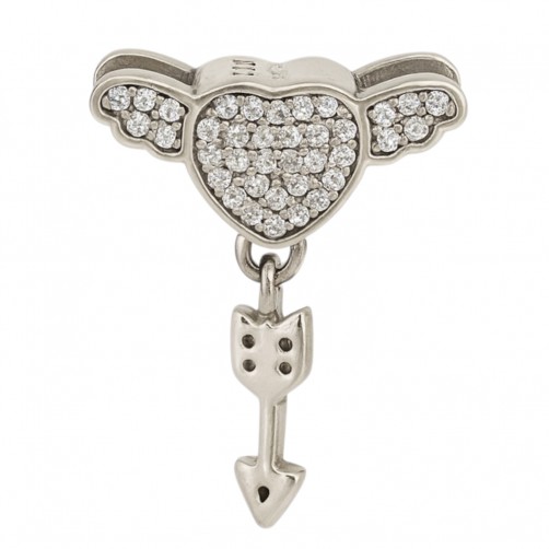 Przedstawiamy Państwu piękną zawieszkę charms pasująca do większości bransoletek typu Pandora. Element wykonany jest ze srebra próby 925 wysadzany przeźroczystymi cyrkoniami, a przedstawia serduszko ze skrzydełkami i zwisającą poniżej strzałą. Wisior z obu stron wygląda tak samo. Charms do wysyłki zapakowany jest w ozdobny woreczek. Zapraszamy do zakupu.