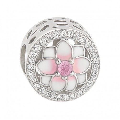 Srebrna zawieszka charms pasująca do większości bransoletek modułowych, również do produktów znanych w Polsce firm. Okrągły charms z kwiatuszkiem, którego pąk jest różową cyrkonią, a po obwodzie zamocowane są przeźroczyste cyrkonie. Zawieszka jest dwustronna. Przedmiot pakowany jest w ozdobny woreczek, który ułatwi jego przechowywanie.