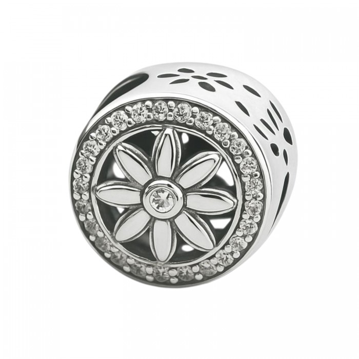 Srebrna zawieszka charms pasująca do większości bransoletek modułowych, również do produktów znanych w Polsce firm. Charms kwiatuszek zdobiony po obwodzie przeźroczystymi cyrkoniami. Przedmiot pakowany jest w ozdobny woreczek, który ułatwi jego przechowywanie.