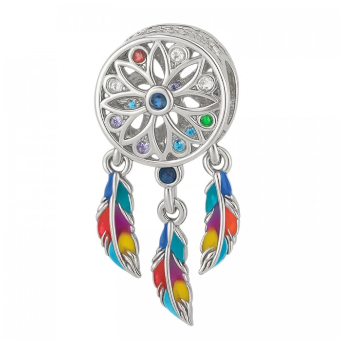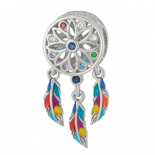 Srebrna zawieszka charms pasująca do większości bransoletek modułowych, również do produktów znanych w Polsce firm. Charms łapacz snów z kolorowymi piórkami oraz kolorowymi cyrkoniami. Od góry widnieje napis DREAMS COME TRUE Przedmiot pakowany jest w ozdobny woreczek, który ułatwi jego przechowywanie.