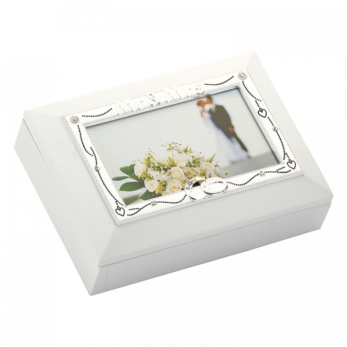 Drewniana szkatułka na biżuterię z ramką na zdjęcie umieszczoną na wieczku. Ramka jest posrebrzana i posiada napis Mr & Mrs, szkatułka nie posiada przegródek, środek jest wyłożony welurem koloru szarego.