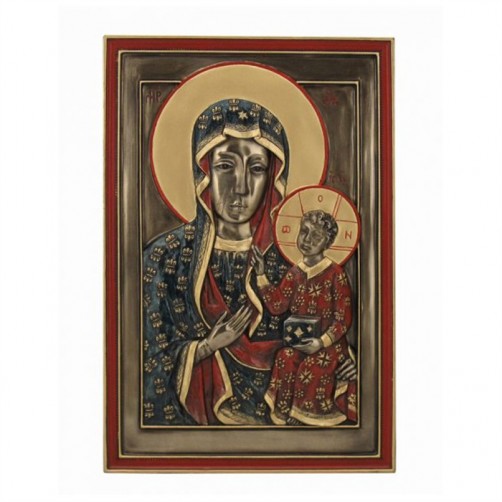 Ikona Ikona Matka Boska Częstochowska wykonana jest z mieszanki żywic pokrytych brązem, a następnie ręcznie malowana. Pochodzi z kolekcji figurek Veronese. Ikonę można powiesić, nie posiada stopki do postawienia. Serdecznie zapraszamy do zakupu.