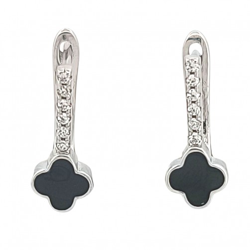 Kolczyki srebrne koniczyna marokańska z czarną emalią oraz niewielkimi, przeźroczystymi cyrkoniami. Kolczyki wykonane są ze srebra próby 925, posiadają zapięcie angielskie. Zapakowane i wysyłane w ozdobnej torebeczce, dzięki czemu stanowią idealny prezent.