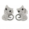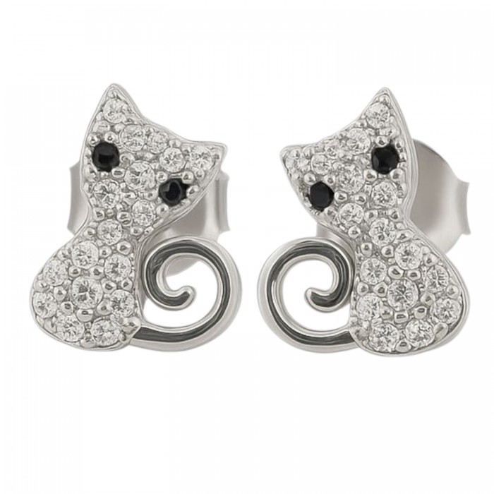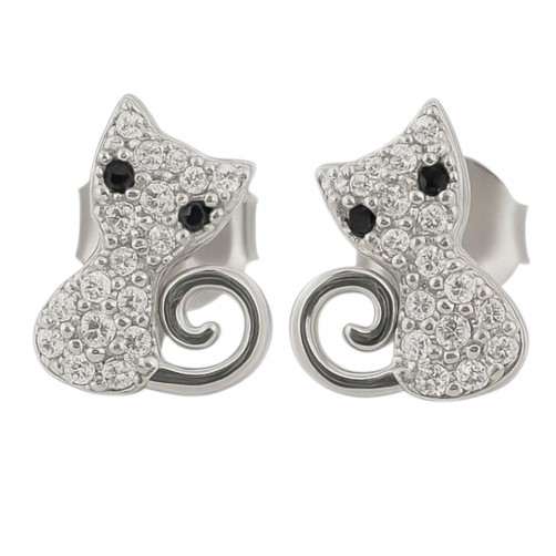 Kolczyki srebrne w kształcie kotów zdobionych niewielkimi cyrkoniami. Srebro użyte do ich wykonania jest próby 925. Kolczyki posiadają zapięcie typu "wkrętka". Zapakowane i wysyłane w ozdobnej torebeczce, dzięki czemu stanowią idealny prezent.