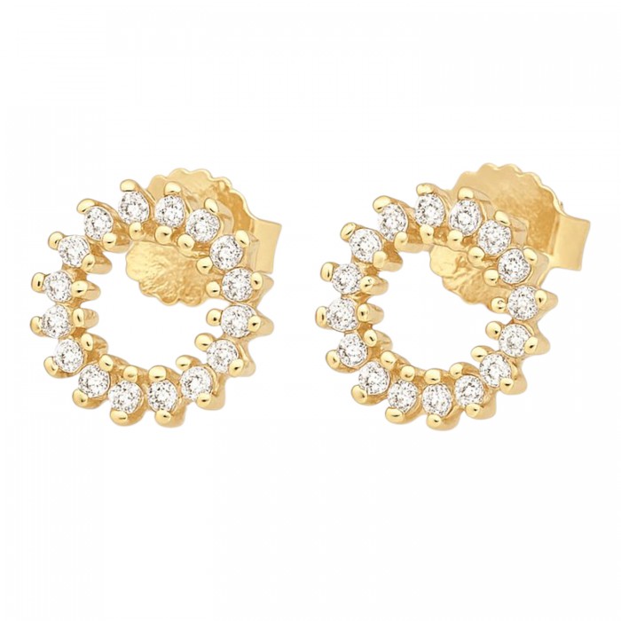 Kolczyki srebrne pozłacane okrągłe zdobione po obwodzie przeźroczystymi cyrkoniami. Srebro użyte do ich wykonania jest próby 925. Kolczyki posiadają zapięcie typu "wkrętka". Zapakowane i wysyłane w ozdobnej torebeczce, dzięki czemu stanowią idealny prezent.