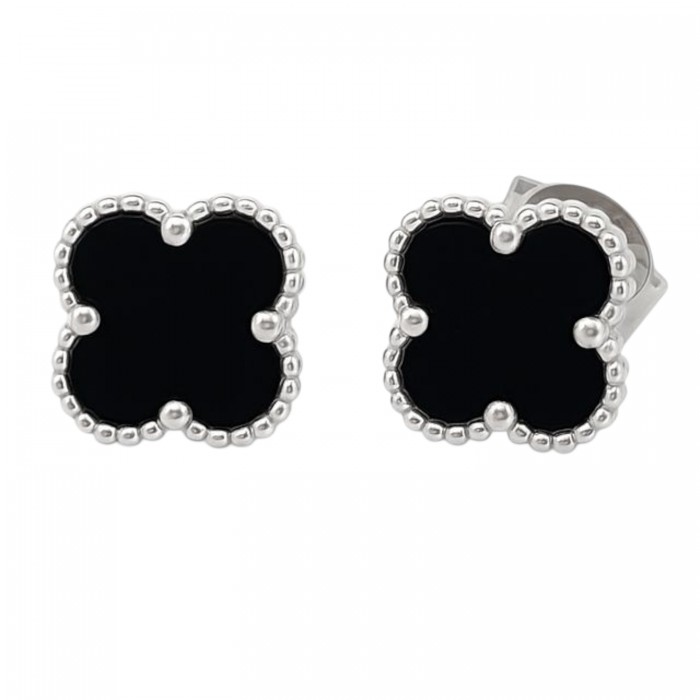 Kolczyki srebrne koniczyna marokańska, którego środek to czarny kamień. Srebro użyte do ich wykonania jest próby 925. Kolczyki posiadają zapięcie typu "wkrętka". Zapakowane i wysyłane w ozdobnej torebeczce, dzięki czemu stanowią idealny prezent.