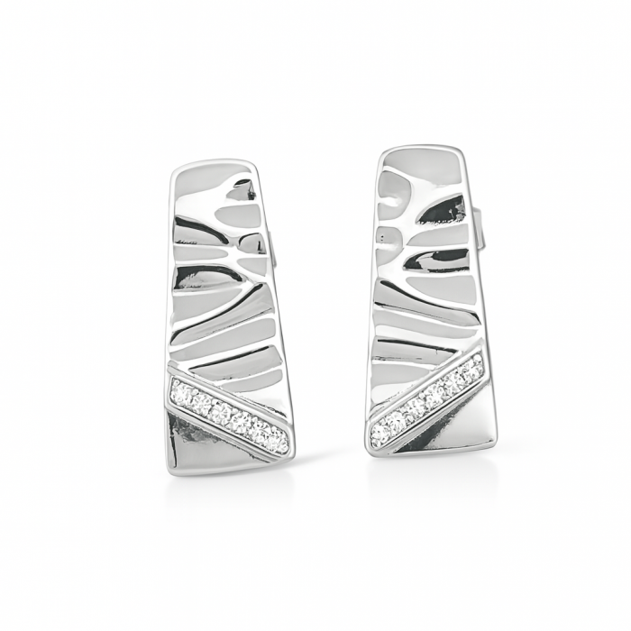 Kolczyki srebrne wkrętki próby 925 zdobione ukośnym paseczkiem wypełnionym cyrkoniami. Serdecznie zapraszamy do zakupu.