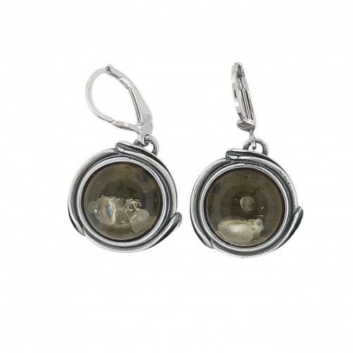 Kolczyki srebrne z zielonym bursztynem, ręcznie wykonane ze srebra najwyższej próby 925. Bursztyn jest szlifowany, zrobiony na kształt półokręgu, zamocowany na środku kolczyków. Wspaniały prezent na każdą okazję dla ukochanej osoby.