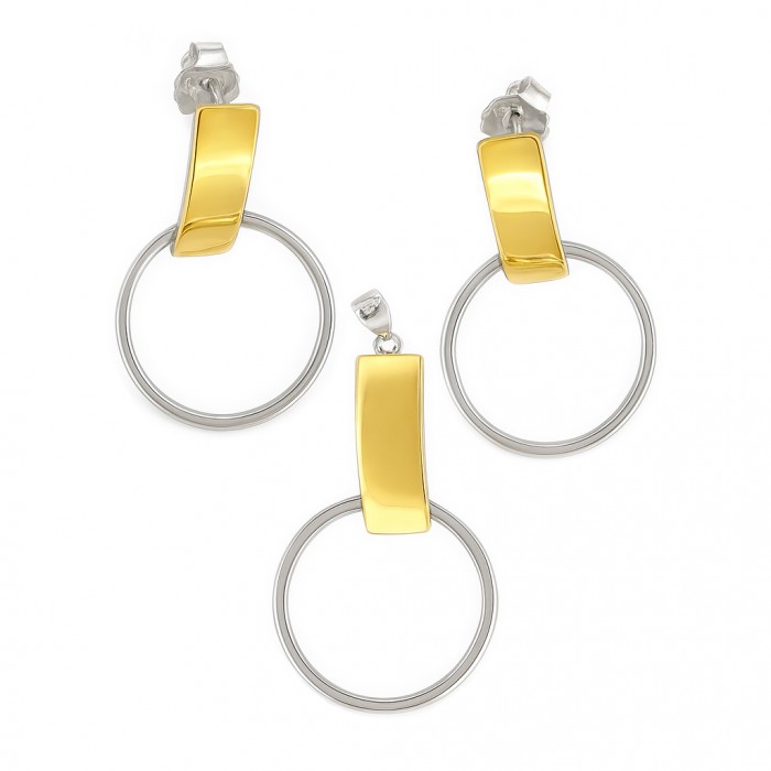 Serdecznie zapraszamy do zakupu bardzo ładnego kompletu biżuterii srebrnej, w składa którego wchodzi wisiorek i kolczyki w kształcie w kształcie okręgu ze pozłacanym, lekko zaokrąglonym prostokątnym elementem. Kolczyki posiadają zapięcie typu "wkrętka". Komplet srebrny wisiorek i kolczyki zapakowany jest w ozdobne etui. Serdecznie zapraszamy do zakupu.