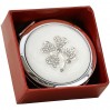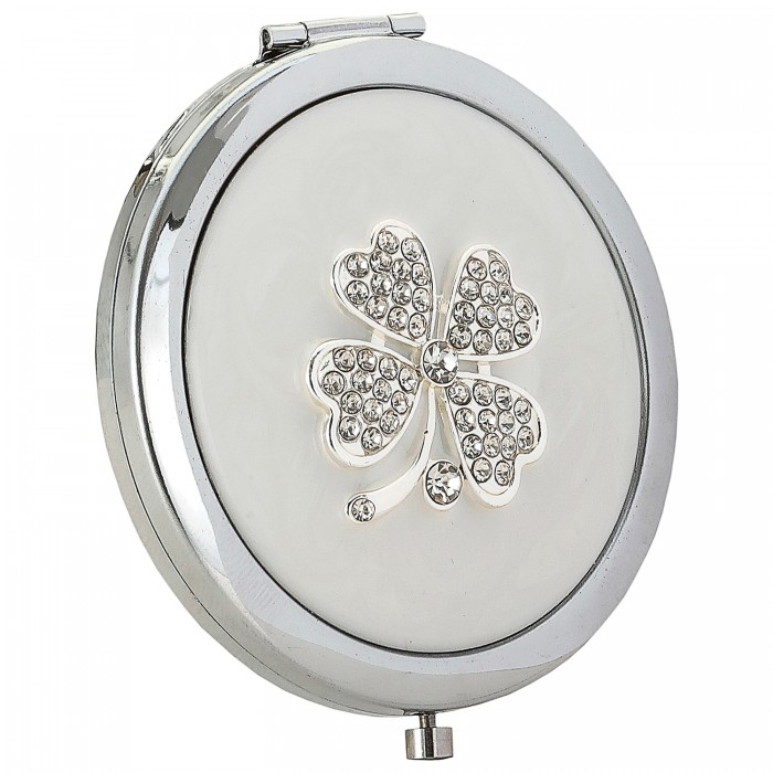 Małe lustereczko wykonane ze stali nierdzewnej. Wieczko lustereczka zdobi koniczynka z przeźroczystymi kamyczkami oraz białą masą plastyczną. Jedno z lusterek wewnątrz jest powiększające. Podstawowe wyposażenie torebki każdej kobiety. Serdecznie zapraszamy do zakupu.