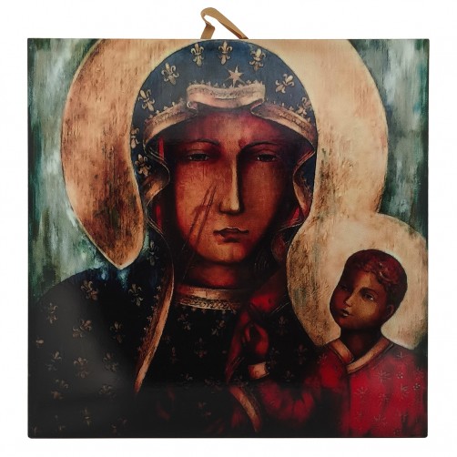 Ikona, obrazek Matka Boska Częstochowska na płytce ceramicznej autorstwa Ireny Kwaśniewskiej - artystka, plastyczka, malarka.