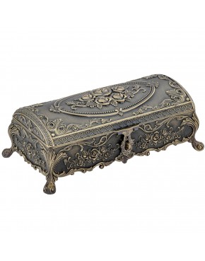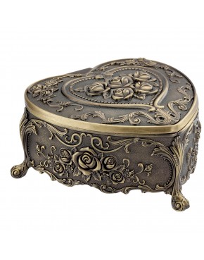 Wyjątkowa szkatułka na biżuterię w kształcie serca. Wykonana z metalu mosiądzowanego. Szkatułka posiada liczne zdobienia w kształcie urokliwych różyczek, zaś jej nóżki przypominają wizerunek aniołków. Kasetka wewnątrz jest wyłożona delikatnym materiałem w bordowym kolorze, nie posiada przegródek. Pomieści wiele elementów biżuterii.