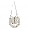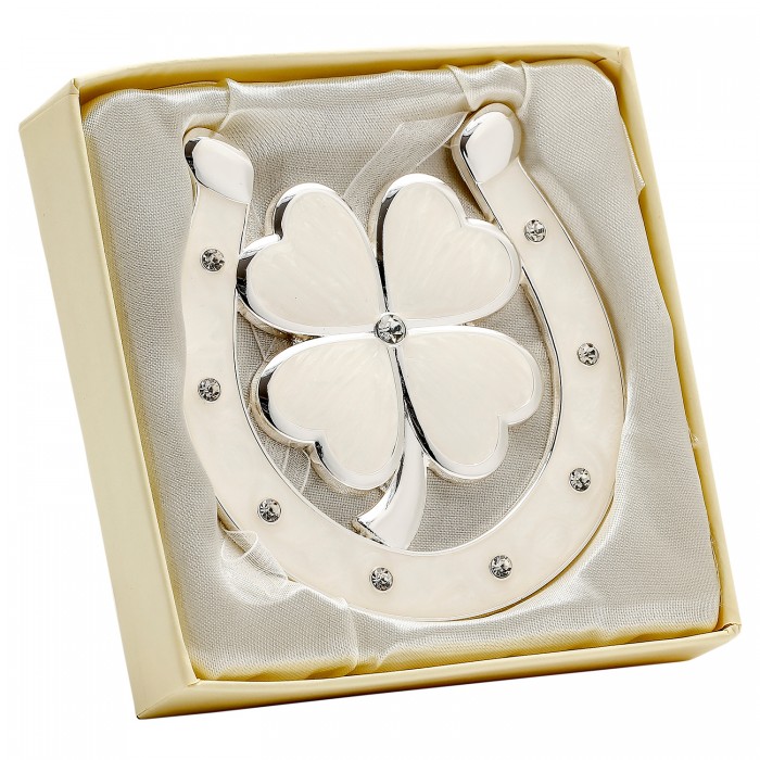 Podkowa na szczęście z centralnie umieszczoną koniczynką. Obrzeże podkowy wypełnione jest masa plastyczną, perłową oraz zdobione przeźroczystymi kamyczkami. Podkowę można również zawiesić na dołączonej kokardce. Serdecznie zapraszamy do zakupu.
