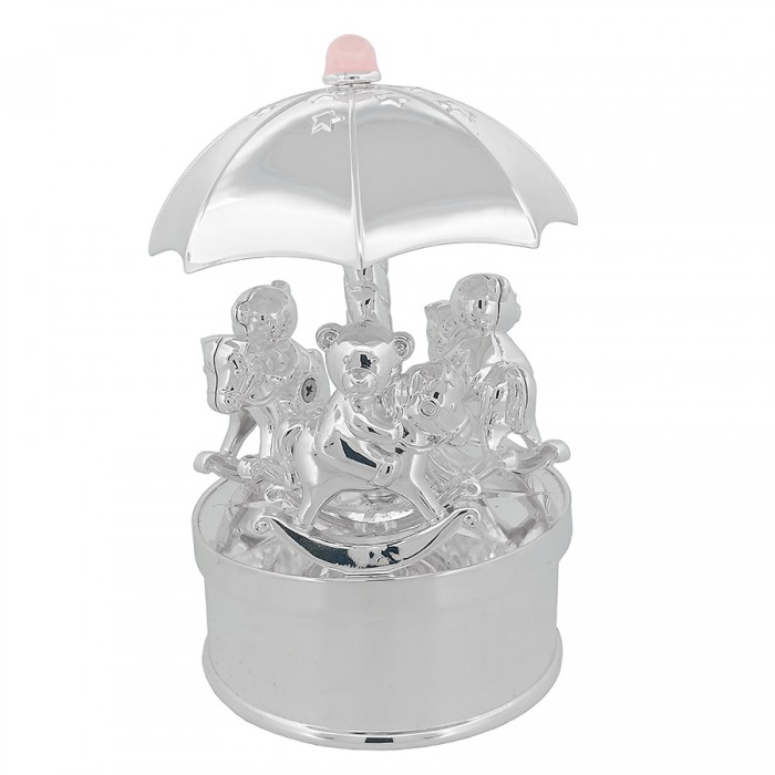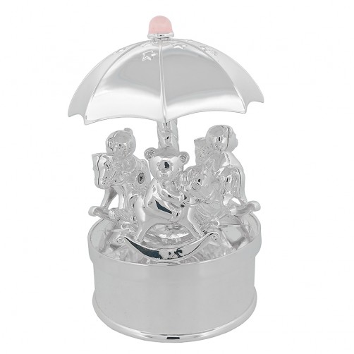 Oferujemy Państwu pozytywkę w kształcie karuzeli z trzema jadącymi na koniach misiami. Pozytywka nakręcana jest od spodu i podczas grania obraca się wokół własnej osi. Pozytywka bardzo ładnie prezentuje się w rzeczywistości i na pewno może być udanym prezentem z okazji chrztu, roczku i wielu innych okazji. Serdecznie zapraszamy do zakupu.