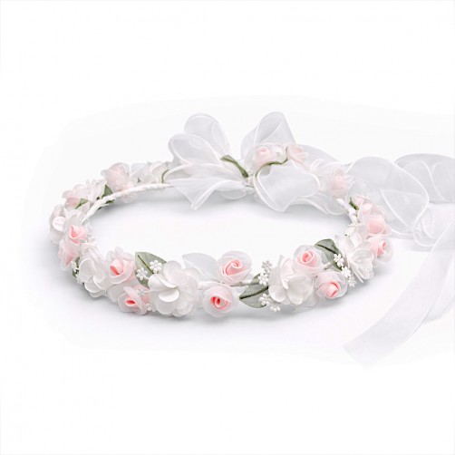 Wianek komunijny wykonany z najwyższą starannością, z bardzo dobrej jakości materiałów. Wianek upleciony jest z biało-różowych materiałowych różyczek przeplatanych z większymi i malutkimi białymi kwiatuszkami. Całość dopełniają stylowe zielone listki, a elegancji dodają mu długie tasiemki i kokarda umieszczona z tyłu wianka.