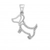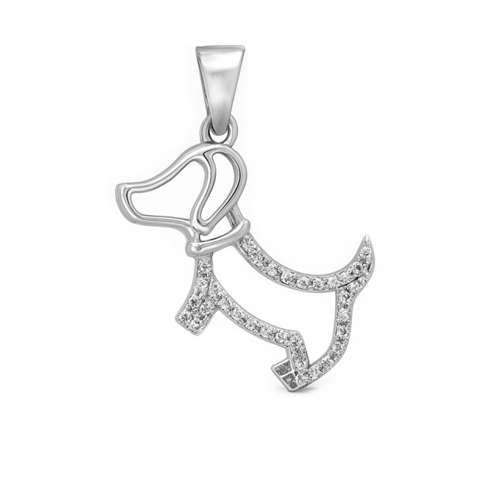 Oferujemy Państwu srebrny wisiorek w kształcie pieska. Cały tułów pieska zdobiony jest niewielkimi, przeźroczystymi cyrkoniami. Zawieszka wysyłana jest w ozdobnej torebeczce, dzięki czemu stanowią idealny prezent.