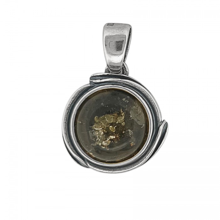 Wisiorek srebrny z zielonym bursztynem, ręcznie wykonany ze srebra najwyższej próby 925. Bursztyn jest szlifowany, zrobiony na kształt półokręgu, zamocowany na środku zawieszki. Wspaniały prezent na każdą okazję dla ukochanej osoby.
