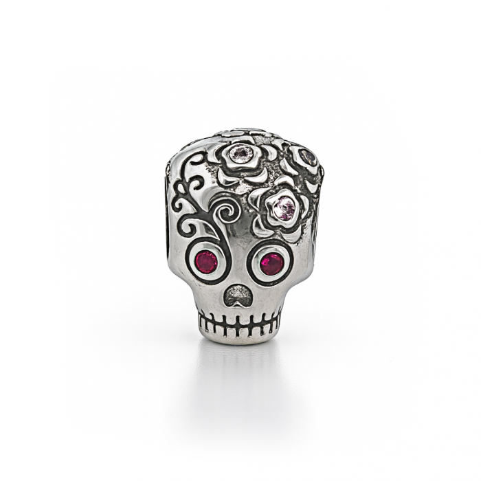 Srebrna zawieszka charms pasująca do większości bransoletek modułowych, również do produktów znanych w Polsce firm. Zawieszka w kształcie czaszki, której głowa ozdobiona jest kilkoma lekko różowymi cyrkoniami. Przedmiot pakowany jest w ozdobny woreczek, który ułatwi jego przechowywanie.