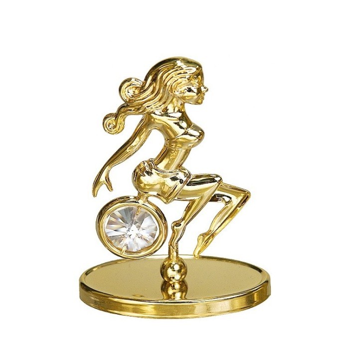 Piękna figurka przedstawiająca znak zodiaku - PANNA, zdobiona jest kryształkami swarovskiego oraz pokryta 24 karatowym złotem. Zodiak przedstawiony jest jako piękna dziewczyna z długimi włosami, siedząca na kółeczku, w którym znajduje się przejrzysty kryształek swarovskiego. Nasza panienka przymocowana jest do owalnej, prostej podstawy, poprzec co może ślicznie prezentować się na Twojej półce. Produkt charakteryzuje się bardzo wysoką jakością wykonania (prześlicznie wygląda w rzeczywistości). Figurka zapakowana jest w ładne pudełeczko (kartonik) koloru fioletowego. Wspaniały pomysł na prezent da osób urodzonych pomiędzy 24.08 – 22.09. Zapraszamy do zakupu.