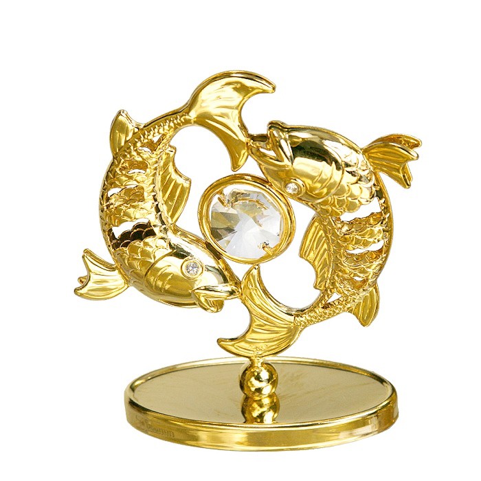 Piękna figurka przedstawiająca znak zodiaku - RYBY. Figurka zdobiona jest kryształkami swarovskiego oraz pokryta 24 karatowym złotem. Rybki ujęte są w momenie łapania łebkami swoich ogonków. Pomiędzy nimi znajduje się okrąg, w którym umieszczony jest pięknie błyszczący kryształek swarovskiego. Ciało rybek jest karbowane poprzez co przypomina łuski, płetwy są ciekawie wykonane a oczy zastąpione małymi kamyczkami. Ryby zamocowane są na płaskiej owalnej podstawie. Figurka jest bardzo precyzyjnie wykonana i zachwyci swą postacią nie jedną osobę. Produkt zapakowany jest w kolorowy kartonik koloru fioletowego. Wspaniały pomysł na prezent dla osób urodzonych pod tym znakiem (19.02 – 20.03). Zapraszamy do zakupu.