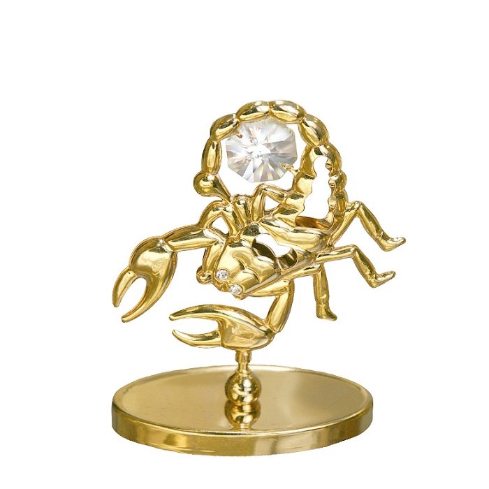 Piękna figurka przedstawiająca znak zodiaku - SKORPION zdobiona jest kryształkami swarovskiego oraz pozłacana 24 karatowym złotem. Znak zodiaku jest umieszczony na eliptycznej, błyszczącej podstawce. Skorpion do podstawy przymocowany jest głową w dół. Figura ma wyeksponowane duże kleszcze i pancerz. Jej zaodwłok czyli ogon jest mocno podwinięty, a między tym zawinięciem umieszczony jest kryształek Swarovski. Zodiak ma podkreślone oczy poprzez dwa przejrzyste kryształki. Zaletą figurki jest to, iż przód jak i tyl są uwypuklone - co oznacza, że z każdej strony będzie się świetnie prezentować. Produkt charakteryzuje się bardzo wysoką jakością wykonania (prześlicznie wygląda w rzeczywistości). Figurka zapakowana jest w oryginalne pudełeczko (kartonik) koloru fioletowego. Wspaniały pomysł na prezent dla osób urodzonych między 23.10 – 22.11. Zapraszamy do zakupu.