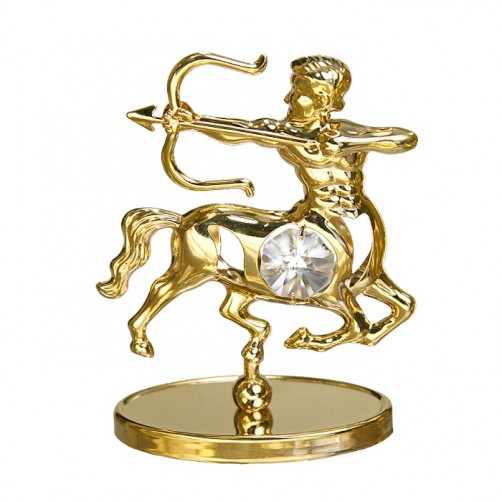 Piękna figurka przedstawiająca znak zodiaku - STRZELEC, zdobiona kryształkami swarovskiego oraz pokryta 24 karatowym złotem. Zodiak to pół człowiek - poł koń umieszczony na owalnej podstawie. Końska część wydaje się być w galopie, ozdobiona jest dużym kryształkiem swarovskiego. Połówka ludzka ma ładnie podkreślony tors i plecy, a w ręku trzyma łuk ze strzałą, która jest wycelowana prosto w serducho kupującego, aby móc urzec go swoim urokiem. Produkt charakteryzuje się wysoką jakością wykonania, a jego zaletą jest obustronne wykonanie, przez co z każdej strony wygląda fascynująco. Figurka zapakowana jest w eleganckie pudełeczko koloru fioletowego. Wspaniały pomysł na prezent dla osób urodzonych w okresie 22.11 – 21.12. Zapraszamy do zakupu.
