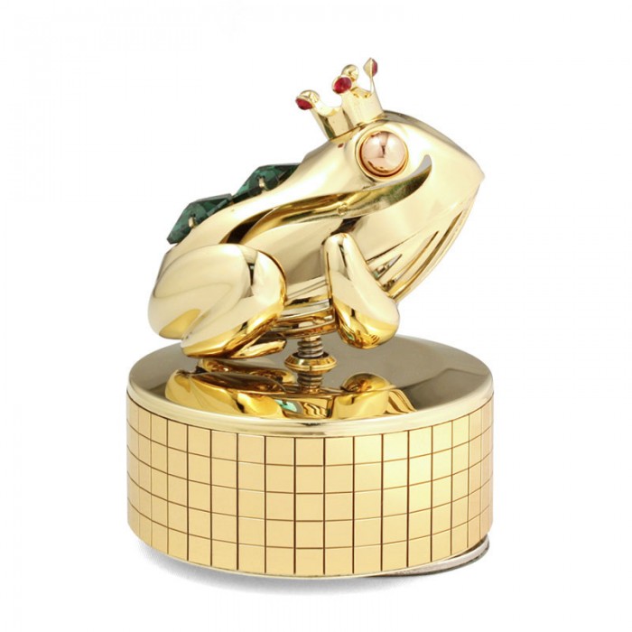 Piękna pozytywka żabka z kryształkami pokryta 24 karatowym złotem. Pozytywka nakręcana jest od spodu i podczas grania melodii, którą jest "WHAT A WONDERFUL WORLD" Luisa Armstronga obraca się wokół własnej osi zataczając również niewielki krąg względem podłoża. Pozytywka ma klasyczny mechanizm - uderzających pręcików o wypustki. Podstawa pozytywki to wysoki okrąg gładki z wierzchu i ozdobny na boku. Malutkie kwadraciki ułożone jeden obok drugiego podczas kręcenia odbijają padające światło co tworzy piękne cienie na podłożu. Żabka umocowana jest na podstawie poprzez sprężynkę, pozwala to na poruszenie żabką lub jej okręcenie. Nasz śliczny duży płaz ozdobiony jest na plecach dwoma zielonymi austriackimi kamieniami. Jego oczy lśnią miedzianym kolorem , a założona na głowę korona ozdobiona pięcioma małymi bordowymi kryształkami. Żabka wydaje się tylko czekać na cudowny pocałunek, aby móc zeskoczyć z podstawy i przemienić się w pięknego księcia. Produkt charakteryzuje się wysoką jakością wykonania, zachwycająco wygląda w rzeczywistości. Figurka zapakowana jest w ładny kolorowy kartonik. Wspaniały pomysł jako prezent na każdą okazję - chrzest czy komunia i dla każdego czy jest to dziecko czy dorosły. Serdecznie zapraszamy do zakupu.